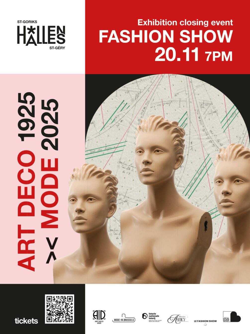 Op 20 november om 19u vindt in de Sint-Gorikshallen de slotshow van LE FASHION SHOW plaats, in samenwerking met Mode-in.Brussels. Dit defilé sluit de expo Art Deco 1925 >< Mode 2025 af en toont werk van tien Brusselse ontwerpers. Een avond vol mode, dans en performance, waarin de lokale creativiteit centraal staat.