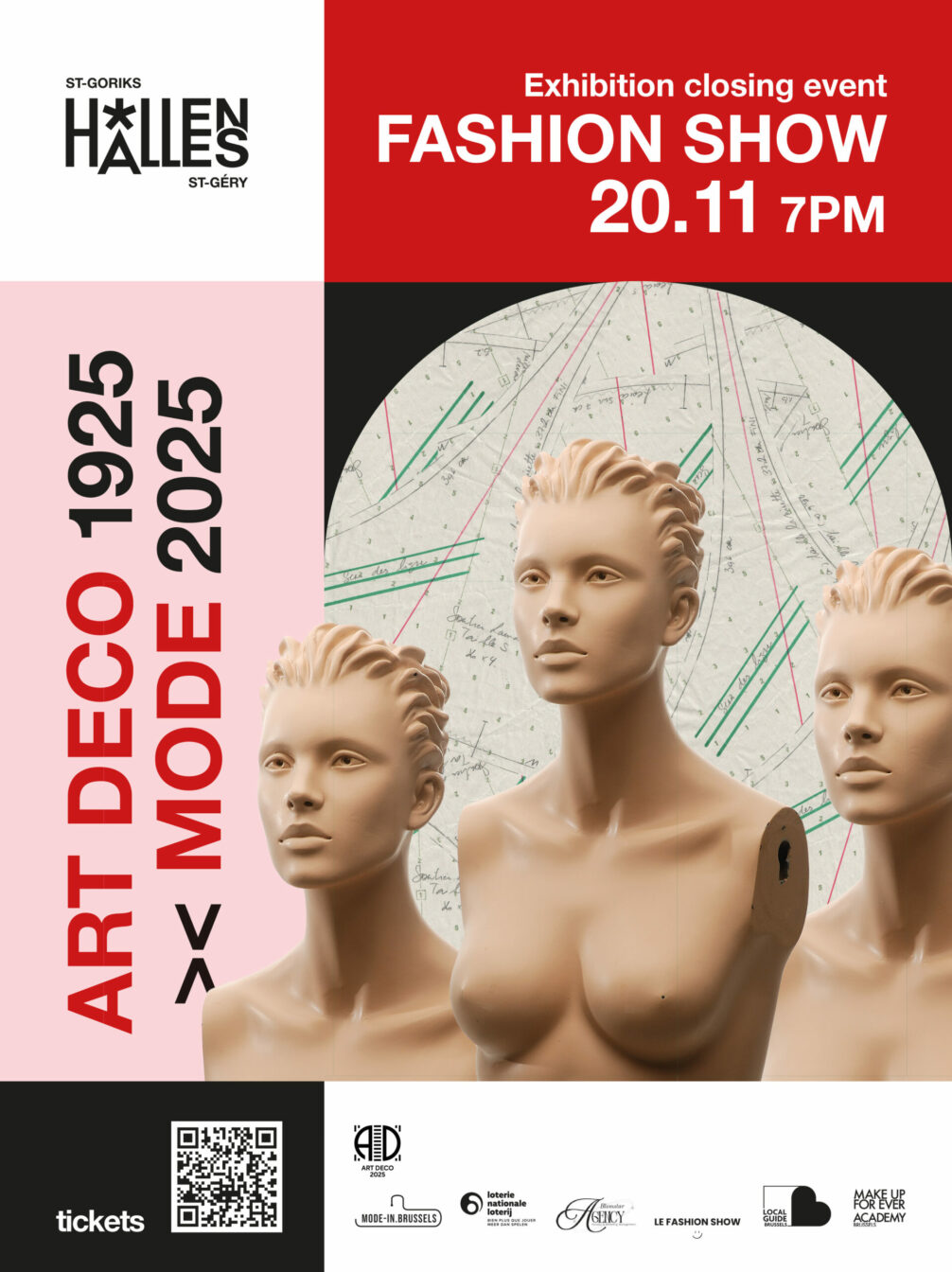 Op 20 november om 19u vindt in de Sint-Gorikshallen de slotshow van LE FASHION SHOW plaats, in samenwerking met Mode-in.Brussels. Dit defilé sluit de expo Art Deco 1925 >< Mode 2025 af en toont werk van tien Brusselse ontwerpers. Een avond vol mode, dans en performance, waarin de lokale creativiteit centraal staat.
